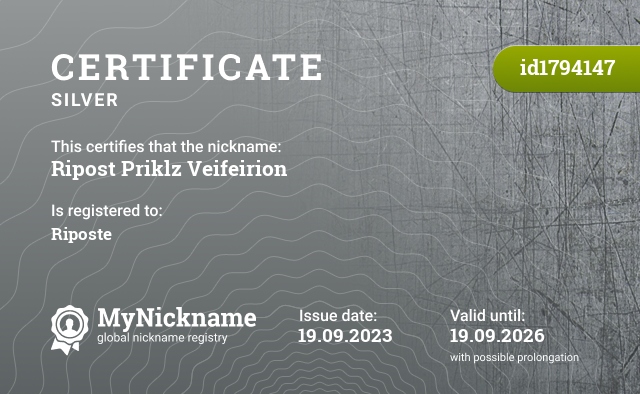 Nickname Ripost Priklz Veifeirion is registered to Riposte. Issued certificate ID1794147. Issue date 19.09.2023.
