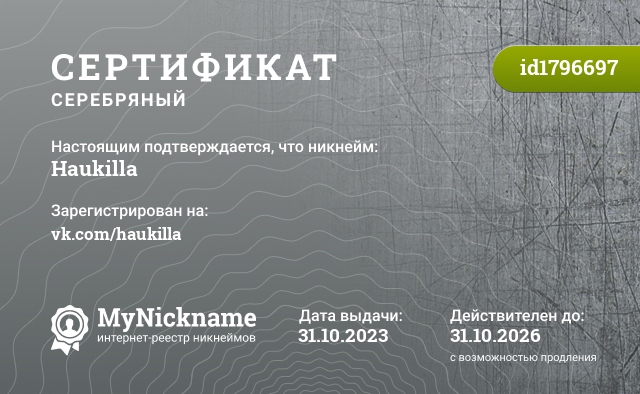 Nickname Haukilla is registered to vk.com/haukilla. Issued certificate ID1796697. Issue date 31.10.2023.