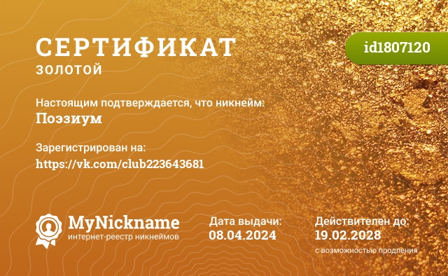 Сертификат на никнейм Поэзиум, зарегистрирован на https://vk.com/club223643681