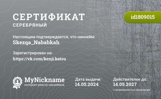 Nickname Skezqa_Nababkah is registered to https://vk.com/kenji.katsu. Issued certificate ID1809015. Issue date 14.05.2024.