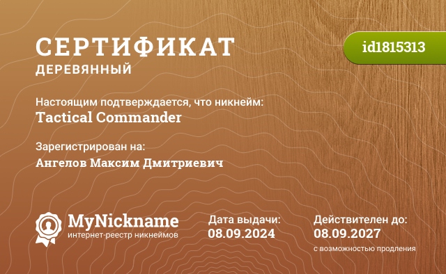 Никнейм Tactical Commander зарегистрирован на Ангелов Максим Дмитриевич. Выдан сертификат id1815313. Дата выдачи 08.09.2024.