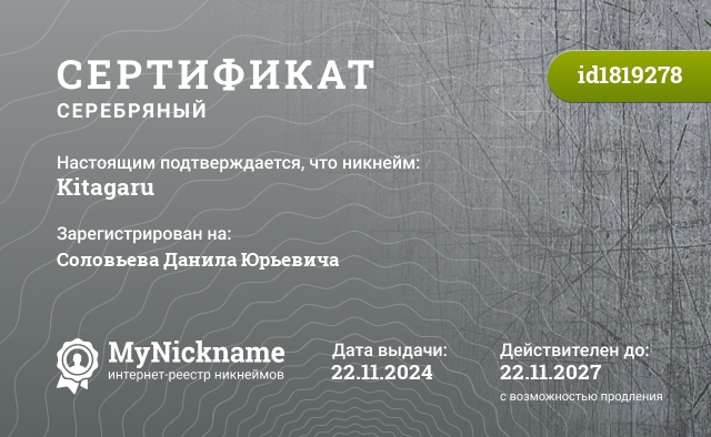 certificate for nickname: Kitagaru (id1819278)