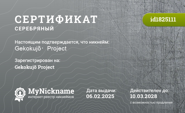 сертификат на никнейм Gekokujō・Project (id1825111)