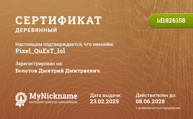 Nickname Pixel_QuEsT_lol is registered to Bolotov Dmitry Dmitrievich. Issued Wooden certificate ID1826158. Issue date 23.02.2025.