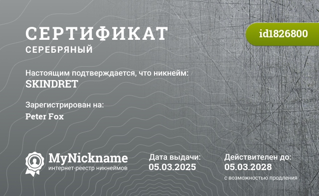 Nickname SKINDRET is registered to Peter Fox. Issued certificate ID1826800. Issue date 05.03.2025.