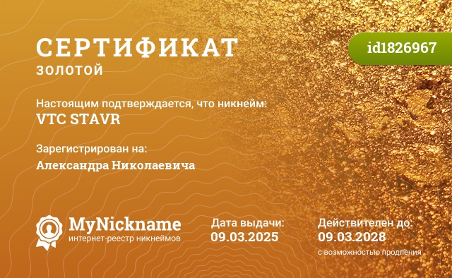 Nickname VTC STAVR is registered to Alexander Nikolaevich. Issued certificate ID1826967. Issue date 09.03.2025.