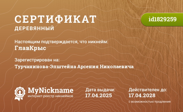 Nickname ГлавКрыс is registered to Turchaninov-Epstein Arseniy Nikolaevich . Issued certificate ID1829259. Issue date 17.04.2025.