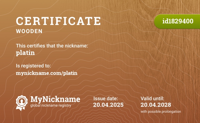 Nickname platin is registered to mynickname.com/platin. Issued certificate ID1829400. Issue date 20.04.2025.