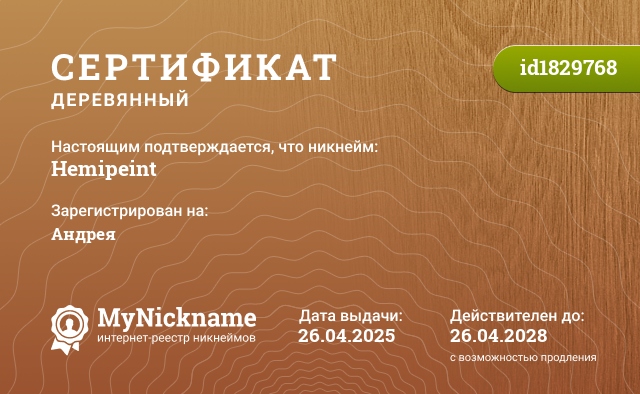Nickname Hemipeint is registered to Andrei. Issued certificate ID1829768. Issue date 26.04.2025.