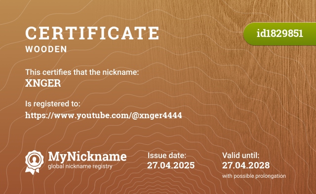 Nickname XNGER is registered to https://www.youtube.com/@xnger4444. Issued certificate ID1829851. Issue date 27.04.2025.