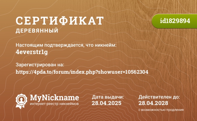 Nickname 4everstr1g is registered to https://4pda.to/forum/index.php?showuser=10562304. Issued certificate ID1829894. Issue date 28.04.2025.