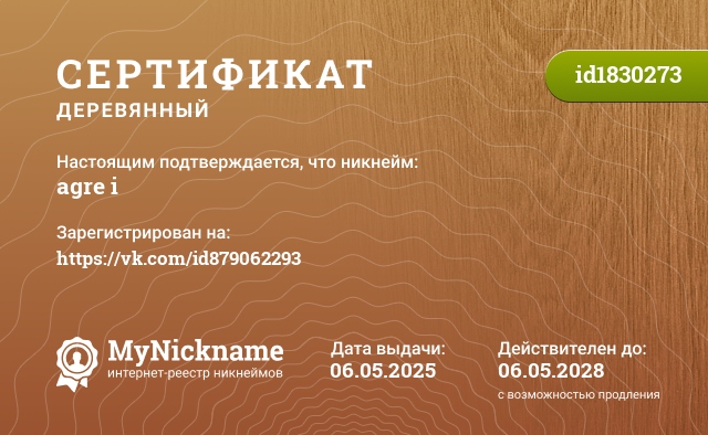 Сертификат на никнейм agre i, зарегистрирован на https://vk.com/id879062293