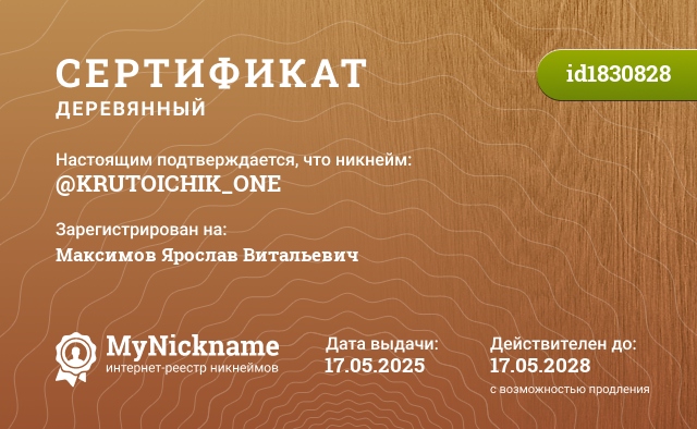 Nickname @KRUTOICHIK_ONE is registered to Maksimov Yaroslav Vitalievich . Issued certificate ID1830828. Issue date 17.05.2025.