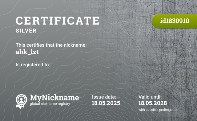 Nickname ahk_lzt is registered to . Issued certificate ID1830910. Issue date 18.05.2025.