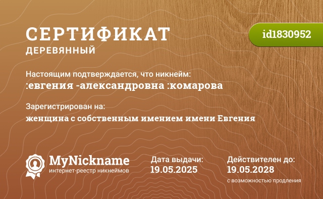 Nickname :евгения -александровна :комарова is registered to a woman with her own estate named Evgenia. Issued certificate ID1830952. Issue date 19.05.2025.