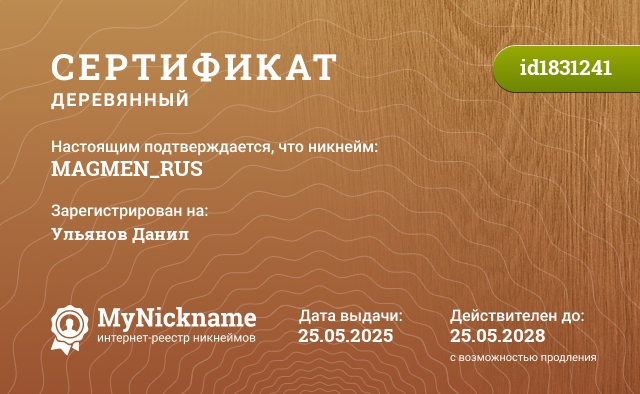 Nickname MAGMEN_RUS is registered to Ulyanov Danil. Issued Wooden certificate ID1831241. Issue date 25.05.2025.