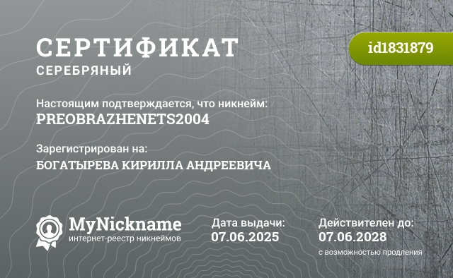 certificate for nickname: PREOBRAZHENETS2004 (id1831879)