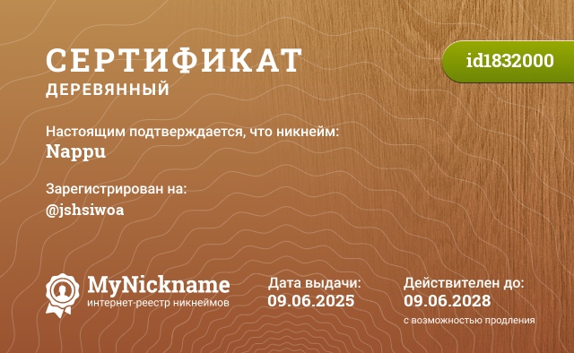 Nickname Nappu is registered to @jshsiwoa. Issued certificate ID1832000. Issue date 09.06.2025.