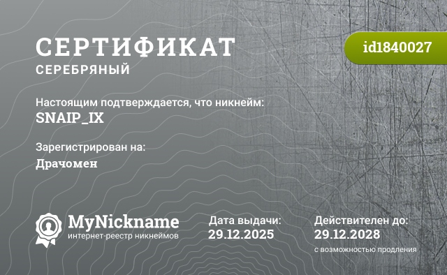 Nickname SNAIP_IX is registered to Drachomen. Issued certificate ID1840027. Issue date 29.12.2025.