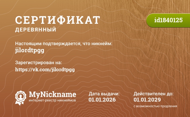 Nickname jilordtpgg is registered to https://vk.com/jilordtpgg. Issued certificate ID1840125. Issue date 01.01.2026.