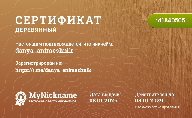Nickname danya_animeshnik is registered to https://t.me/danya_animeshnik. Issued certificate ID1840505. Issue date 08.01.2026.