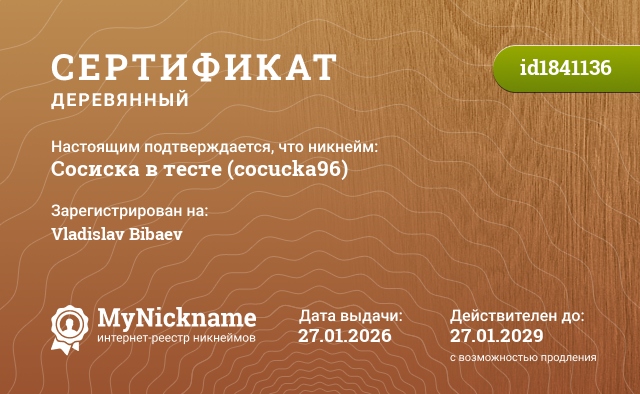 certificate for nickname: Сосиска в тесте (cocucka96) (id1841136)