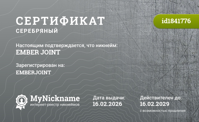 Nickname EMBER JOINT is registered to HUMAN JOINT. Issued certificate ID1841776. Issue date 16.02.2026.