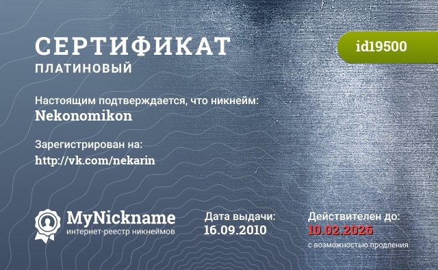 Nickname Nekonomikon is registered to http://vk.com/nekarin. Issued certificate ID19500. Issue date 16.09.2010.