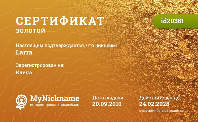Nickname Larra is registered to Helen. Issued certificate ID20381. Issue date 20.09.2010.