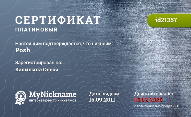 Nickname Posh is registered to Kalinina Olesya. Issued Platinum certificate ID21357. Issue date 15.09.2011.