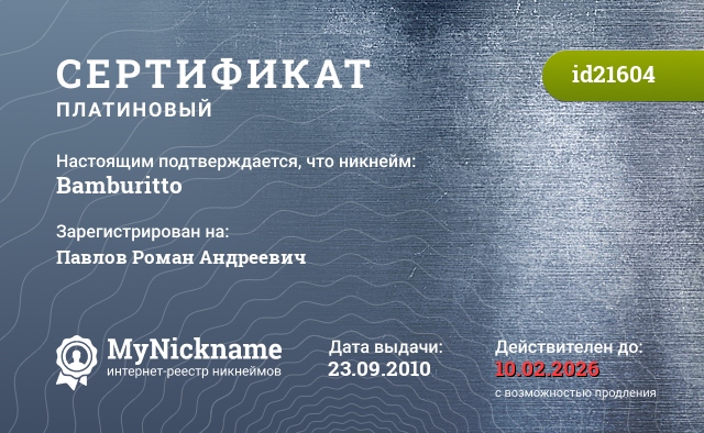 Nickname Bamburitto is registered to Pavlov Roman Andreevich. Issued certificate ID21604. Issue date 23.09.2010.