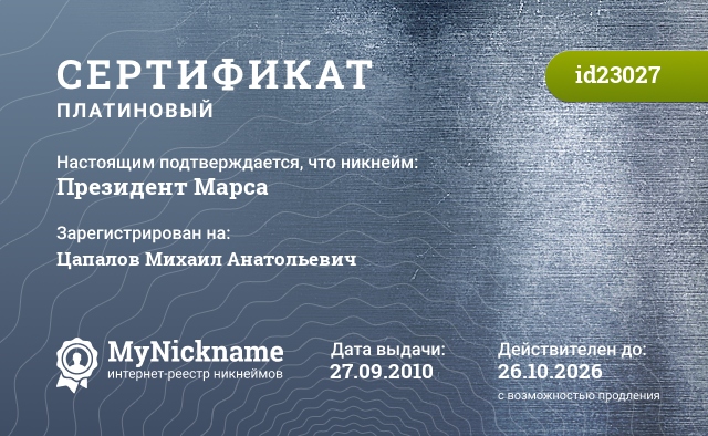 Nickname Президент Марса is registered to Tsapalov Mikhail Anatolievich. Issued certificate ID23027. Issue date 27.09.2010.