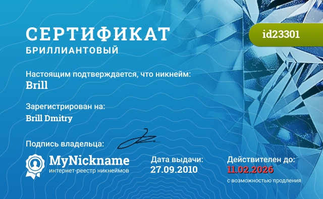 Nickname Brill is registered to Brill Dmitry. Issued certificate ID23301. Issue date 27.09.2010.