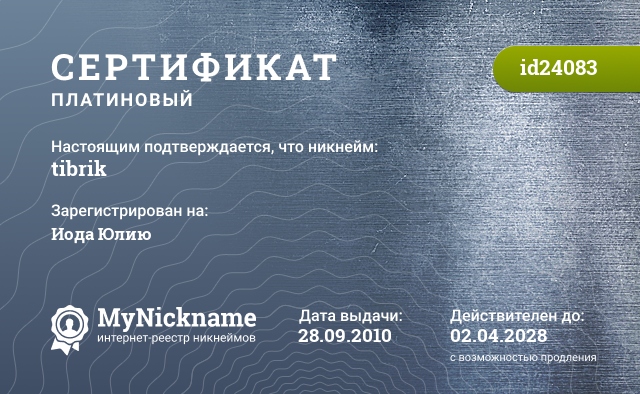Nickname tibrik is registered to Yoda Julia. Issued certificate ID24083. Issue date 28.09.2010.