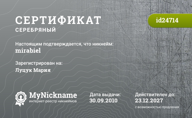 Nickname mirabiel is registered to Lutsuk Maria. Issued certificate ID24714. Issue date 30.09.2010.
