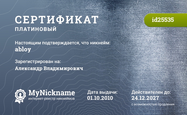 Nickname abloy is registered to Alexander Vladimirovich. Issued certificate ID25535. Issue date 01.10.2010.