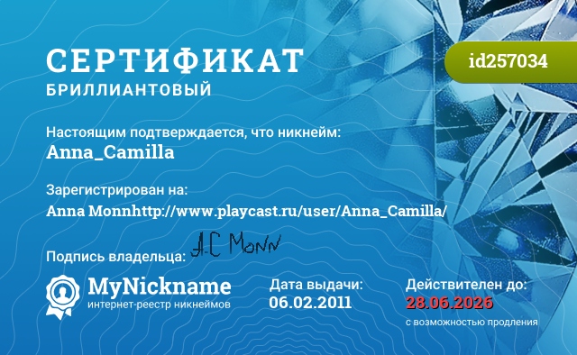 The nickname is registered on the website http://www.playcast.ru/user/Anna_Camilla/about in 2009. I'm waiting for a visit! I create cool playcasts;) :) Owner of the "Irony of Fate On_Line" coo http: //www.playcast. ru / communities / lllxxc /? act = about Always welcome guests!