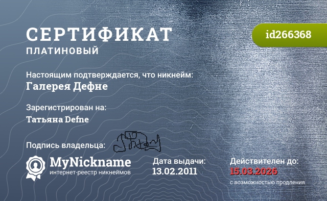 Nickname Галерея Дефне is registered to Tatiana Defne. Issued certificate ID266368. Issue date 13.02.2011.