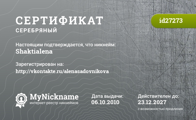 Nickname Shaktialena is registered to http://vkontakte.ru/alenasadovnikova. Issued certificate ID27273. Issue date 06.10.2010.