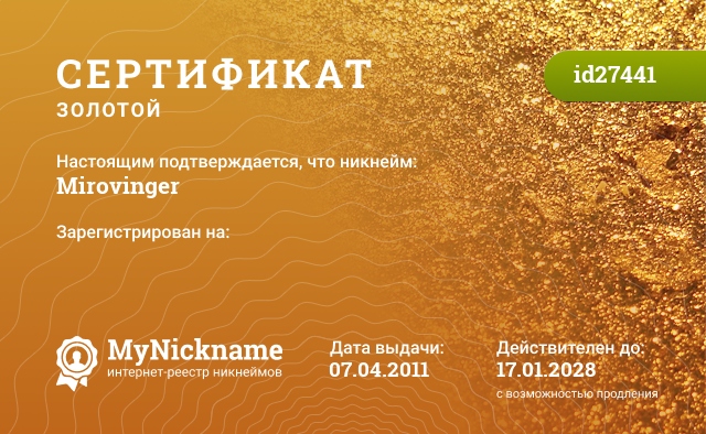 certificate for nickname: Mirovinger (id27441)