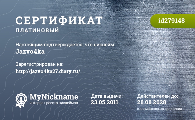 Никнейм Jazvo4ka зарегистрирован на http://jazvo4ka27.diary.ru/. Выдан сертификат id279148. Дата выдачи 23.05.2011.