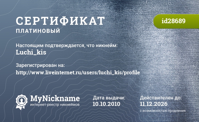 Nickname Luchi_kis is registered to http://www.liveinternet.ru/users/luchi_kis/profile. Issued certificate ID28689. Issue date 10.10.2010.