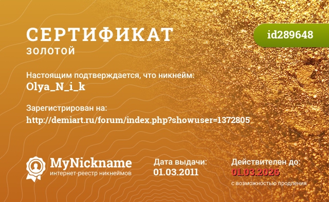 Никнейм Olya_N_i_k зарегистрирован на http://demiart.ru/forum/index.php?showuser=1372805. Выдан сертификат id289648. Дата выдачи 01.03.2011.
