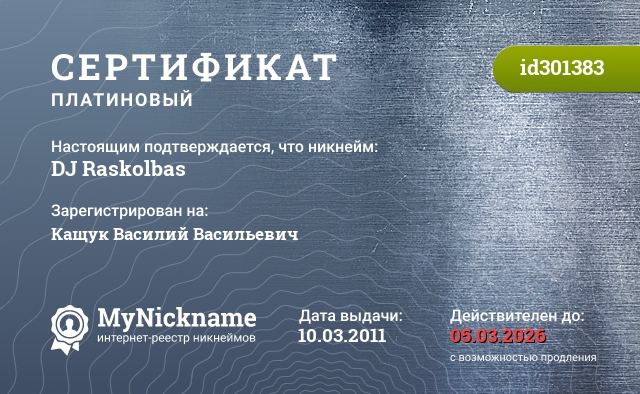 Nickname DJ Raskolbas is registered to Kashchuk Vasily Vasilievich. Issued certificate ID301383. Issue date 10.03.2011.