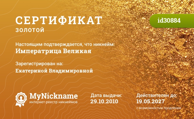 Nickname Императрица Великая is registered to Ekaterina Vladimirovna. Issued certificate ID30884. Issue date 29.10.2010.