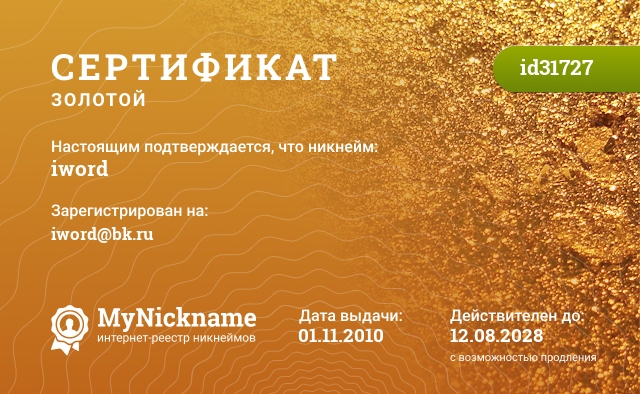 Nickname iword is registered to iword@bk.ru. Issued certificate ID31727. Issue date 01.11.2010.