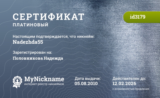сертификат на никнейм Nadezhda55 (id3179)