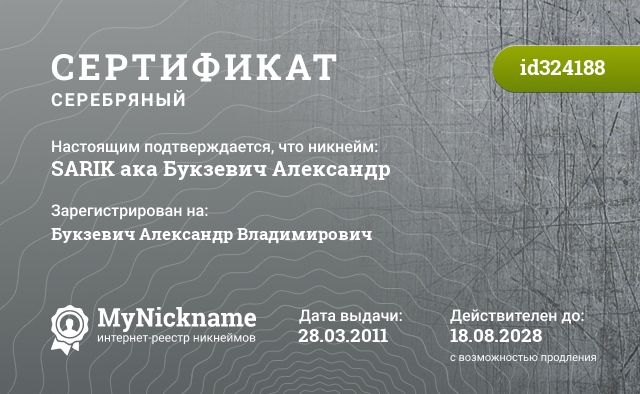 сертификат на никнейм SARIK ака Букзевич Александр (id324188)