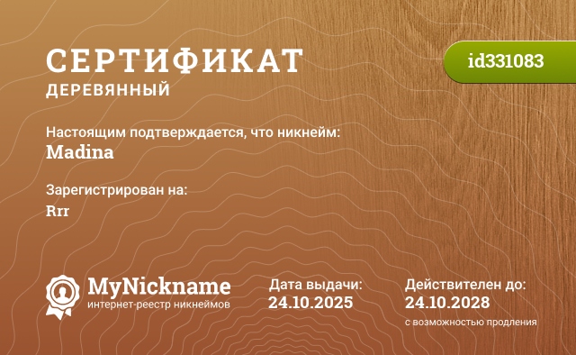 Nickname Madina is registered to Rrr. Issued Wooden certificate ID331083. Issue date 24.10.2025.