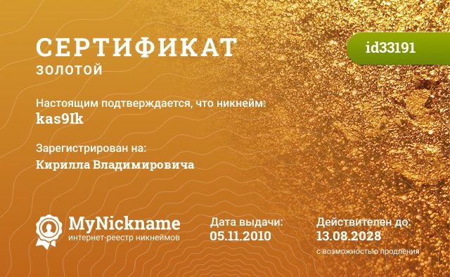 Nickname kas9Ik is registered to Kirill Vladimirovich. Issued certificate ID33191. Issue date 05.11.2010.